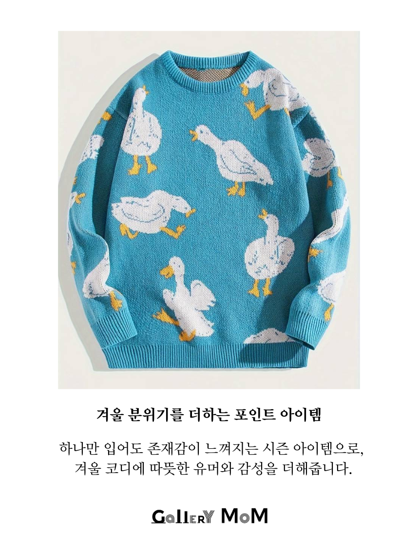 갤러리몸 쇼핑몸의 따뜻한 거위 풀오버 스웨터는 귀여운 동물 프린트와 루즈한 실루엣으로, 가을·겨울 시즌 감성 스타일을 완성해주는 포근한 니트입니다.