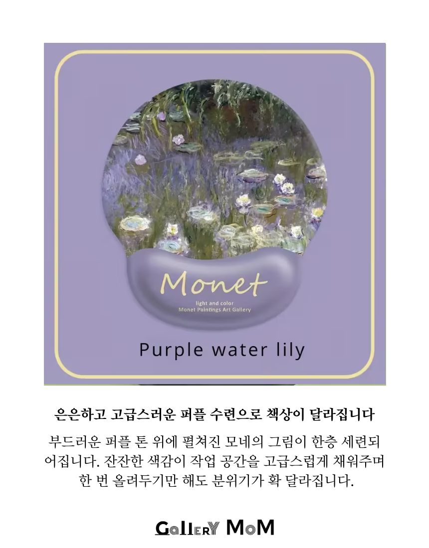 보라색의 은은한 톤 위에 모네의 수련이 부드럽게 펼쳐지며,