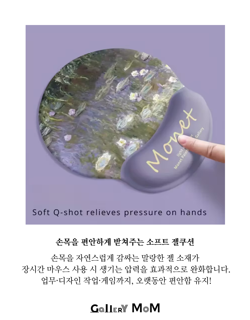 일반 패드와 달리 젤 쿠션이 손목 관절을 자연스러운 각도로 잡아주어 통증을 줄여줍니다.