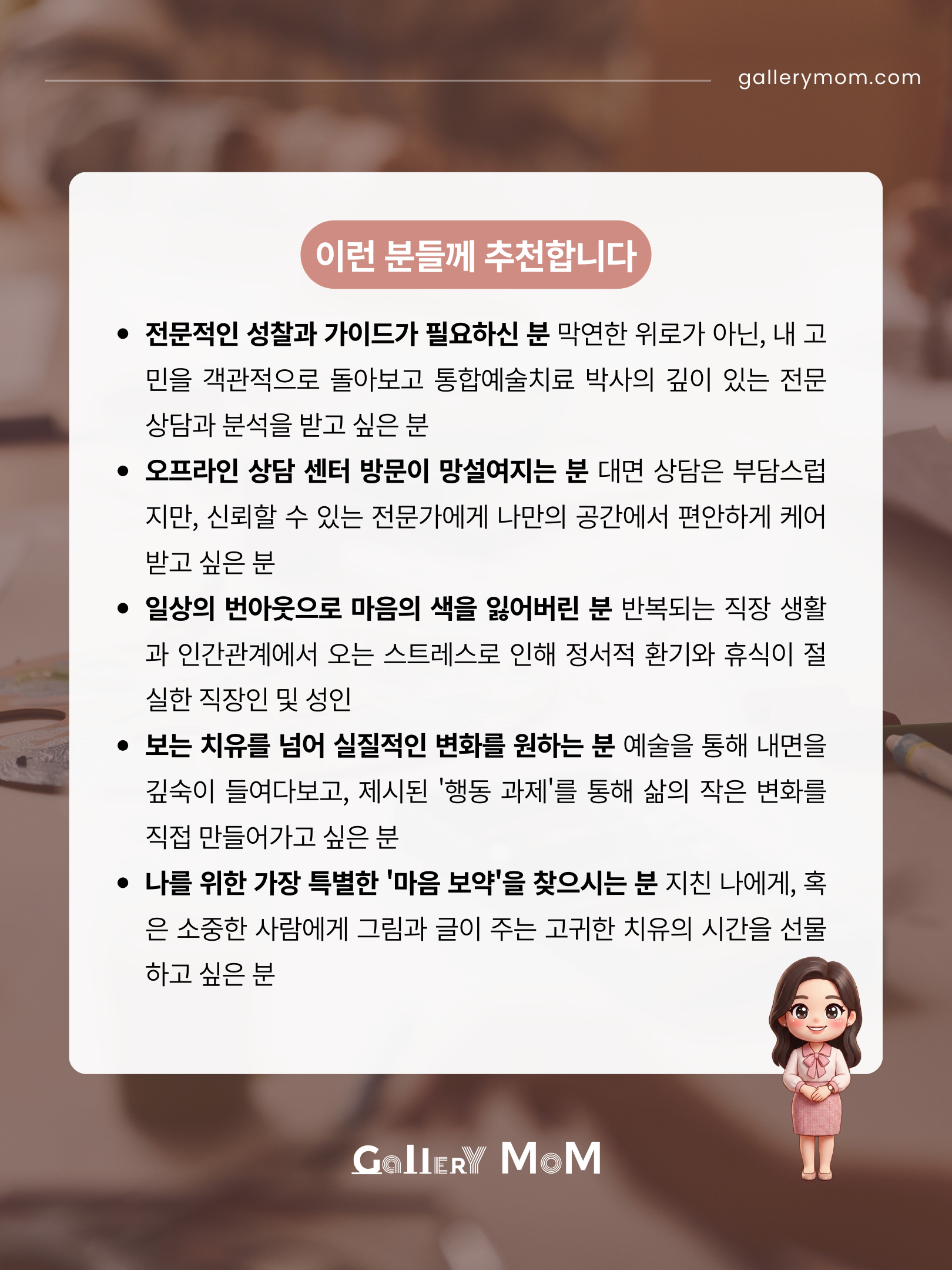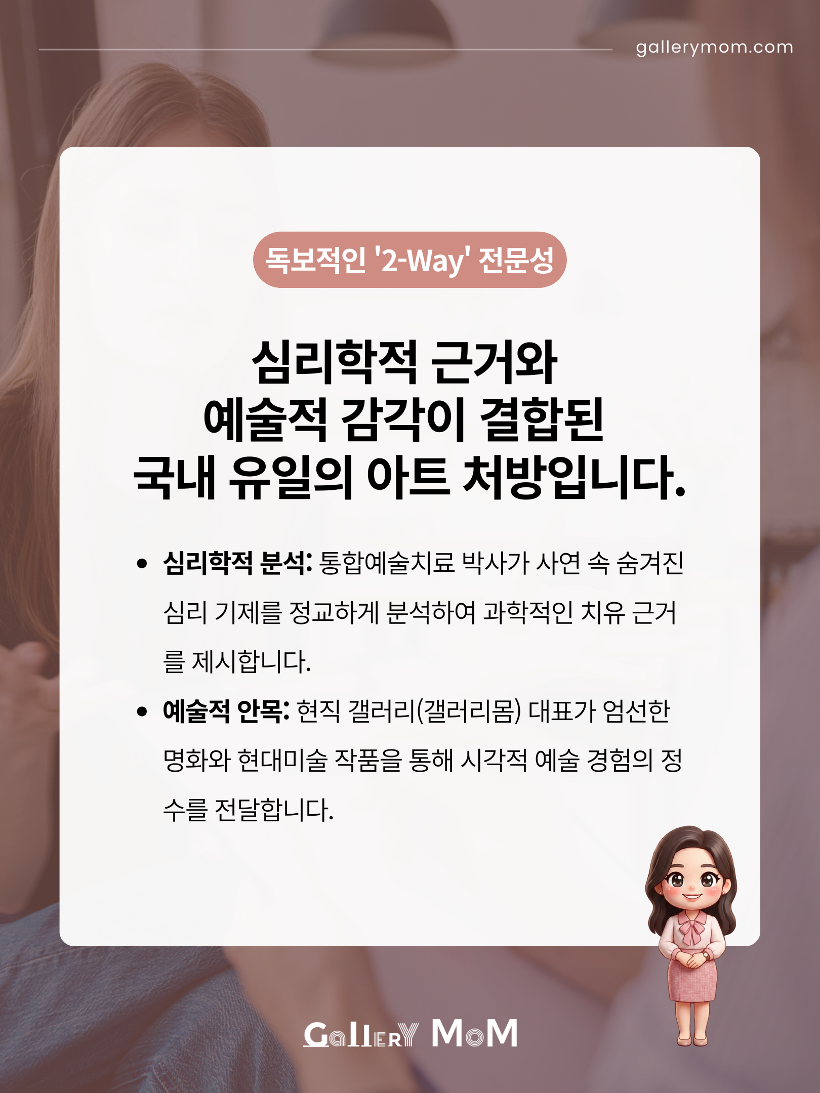 “갤러리에서 찾은 나의 예술성, 오늘도 갤러리몸에서 감성 한 조각을 담아가세요.”