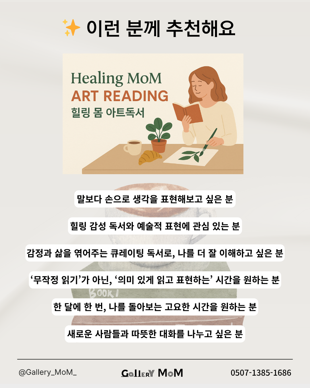 ※ 큐레이팅된 독서와 감성 아트워크, 소규모 티살롱이 함께합니다.