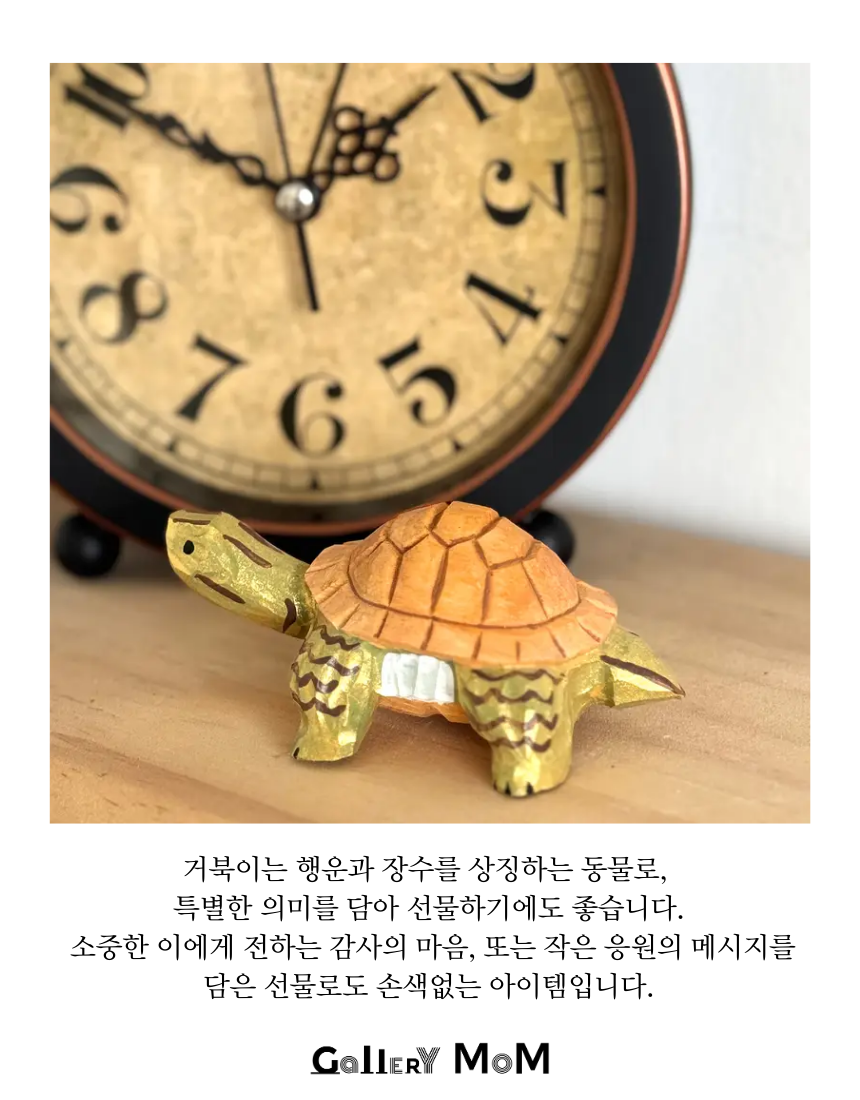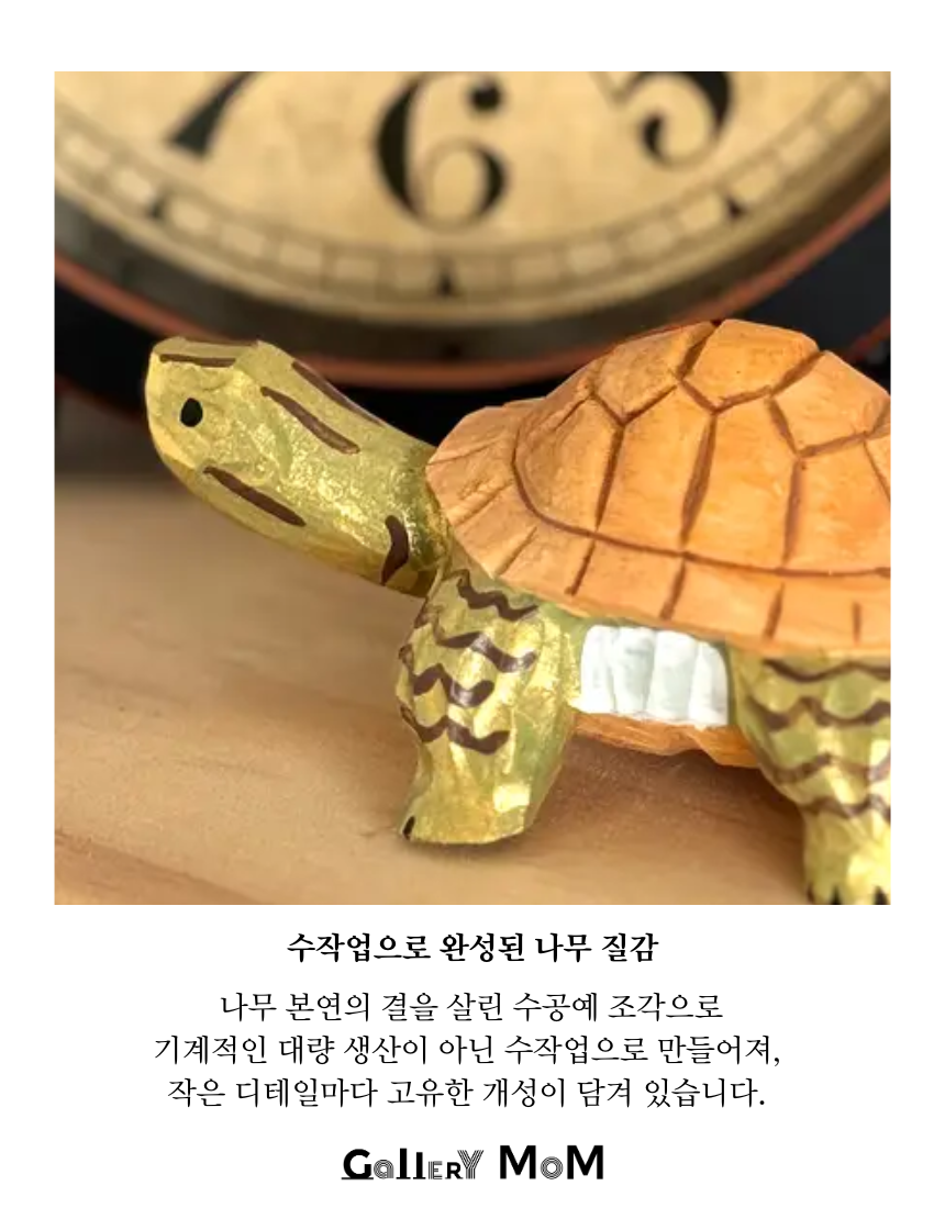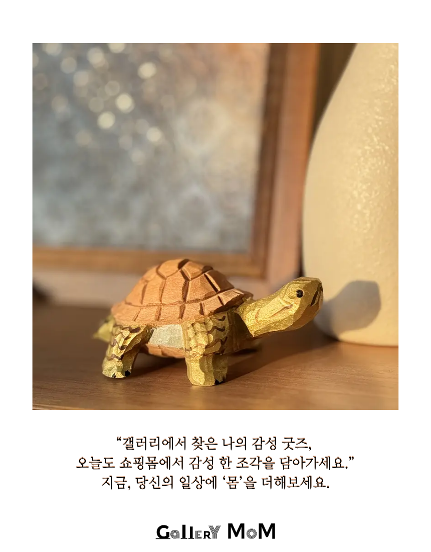 갤러리몸의 감성 굿즈, 반짝이 채색 우드 거북이 조각은 단순한 장식품을 넘어 당신의 공간에 특별한 의미와 온기를 불어넣는 아이템입니다. 손 안에 들어오는 아담한 사이즈로, 집이나 사무실 어디에 두어도 따뜻한 존재감을 발휘합니다.