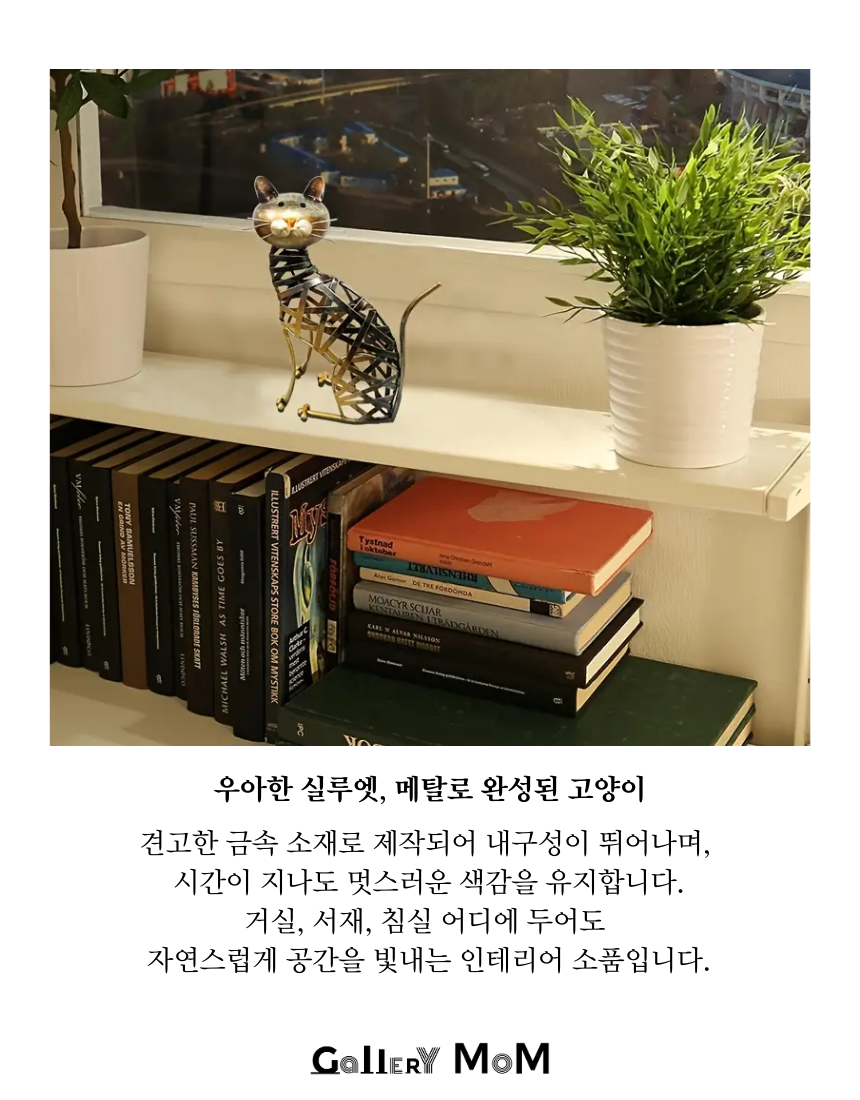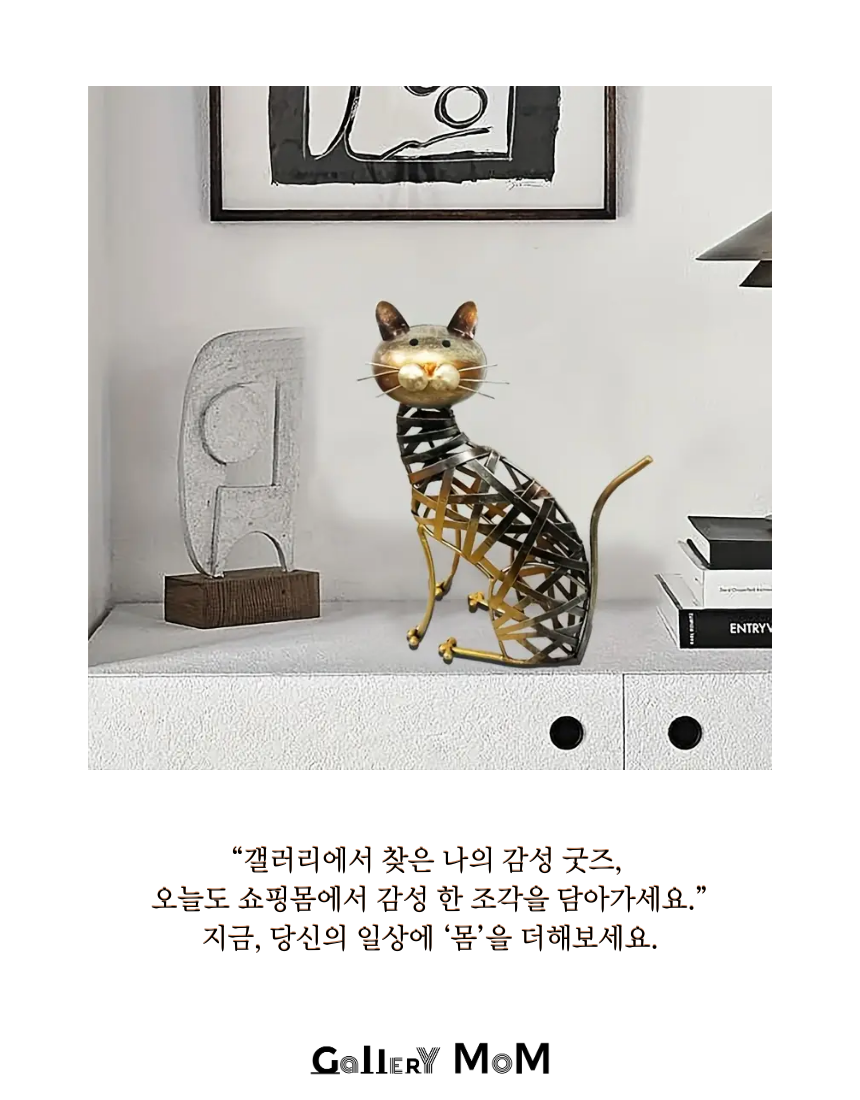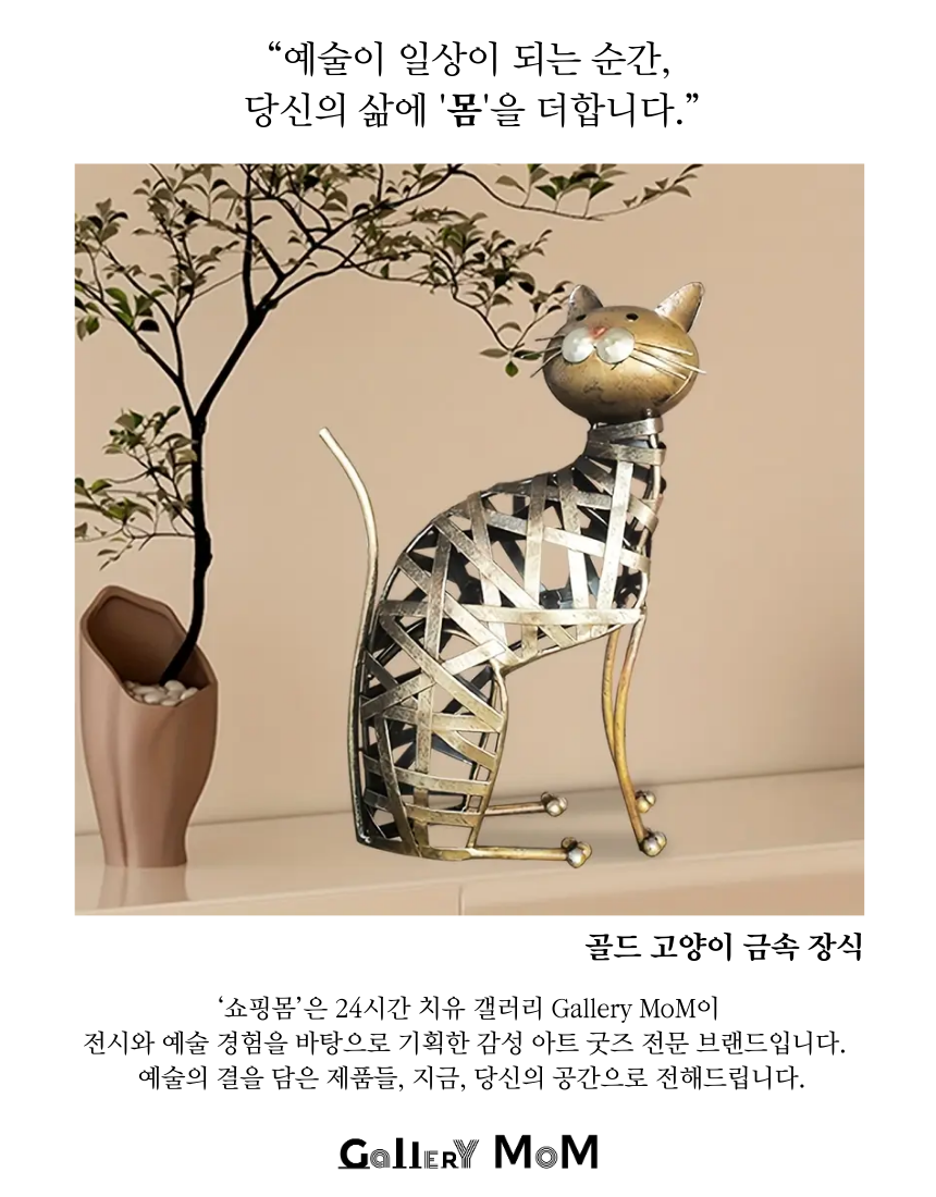 갤러리몸에서 선보이는 골드 고양이 금속 장식은 단순한 오브제가 아니라, 집안의 분위기를 품격 있게 바꾸어주는 감성 인테리어 아이템입니다. 고양이의 우아한 자태와 금속의 견고함이 어우러져, 어디에 두어도 세련된 존재감을 드러냅니다.