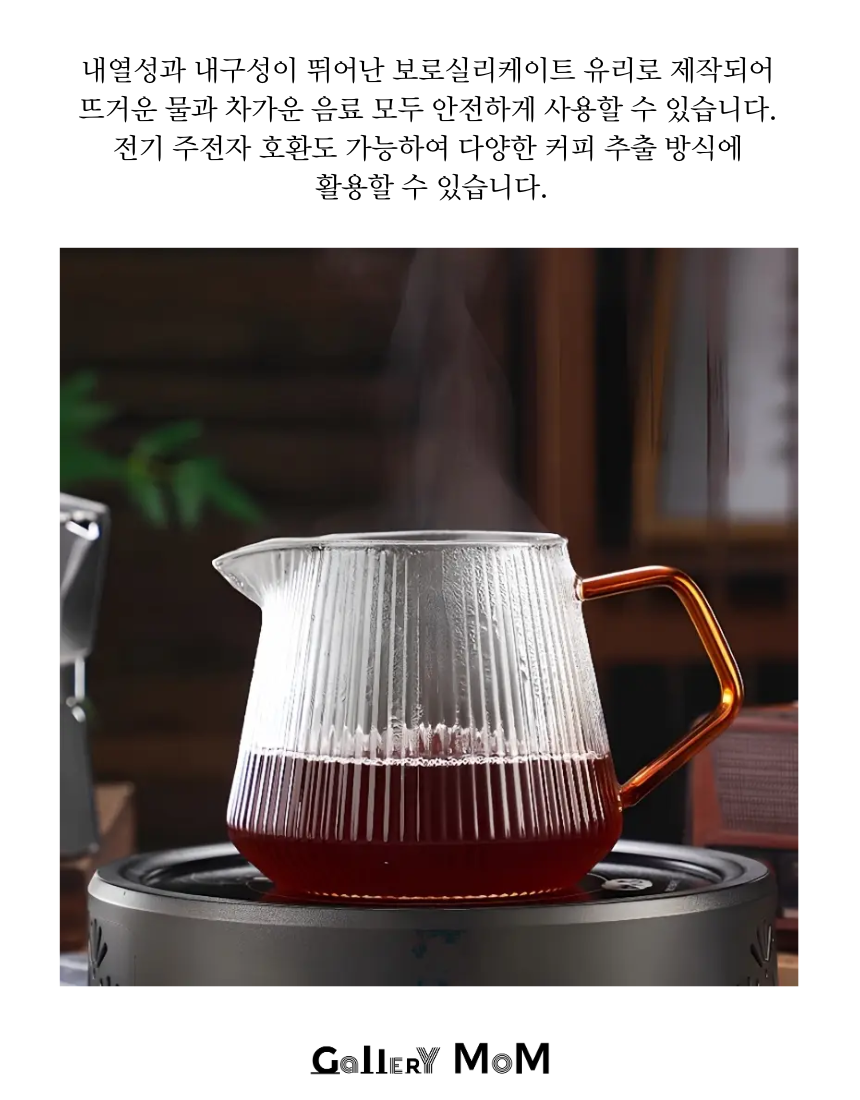 갤러리 감성을 담은 쇼핑몸 고강도 보로실리케이트 유리 커피 주전자는 커피와 차를 즐기는 순간을 더욱 특별하게 만들어줍니다. 심플하면서도 세련된 디자인, 그리고 내열성이 뛰어난 소재로, 홈카페와 티타임을 즐기는 모든 분들께 꼭 필요한 아이템입니다.