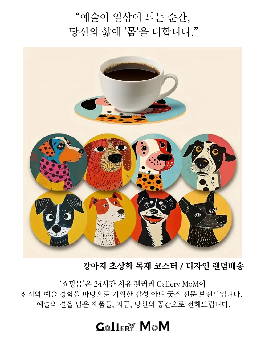 갤러리 감성을 담은 쇼핑몸 강아지 초상화 목재 코스터는