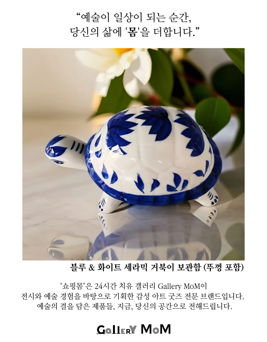 갤러리 감성을 담은 쇼핑몸 블루 & 화이트 세라믹 거북이 조각상은 단순한 장식품을 넘어, 뚜껑이 포함된 보관 용기로 활용 가능한 독특한 아이템입니다. 세라믹 특유의 고급스러운 질감과 블루 앤 화이트의 클래식한 조화가 어우러져 공간에 세련된 포인트를 더합니다.